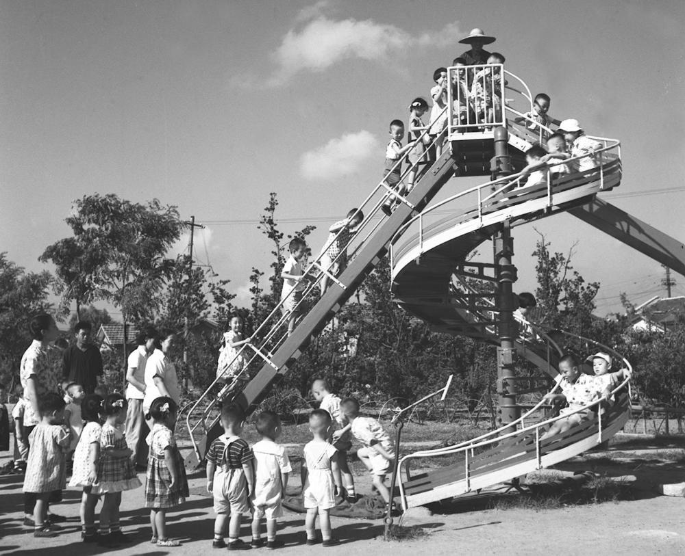 ↑1955年8月,在上海市海伦路儿童公园儿童活动区里最受欢迎的螺旋滑梯。新华社记者 杨薄涛 摄
