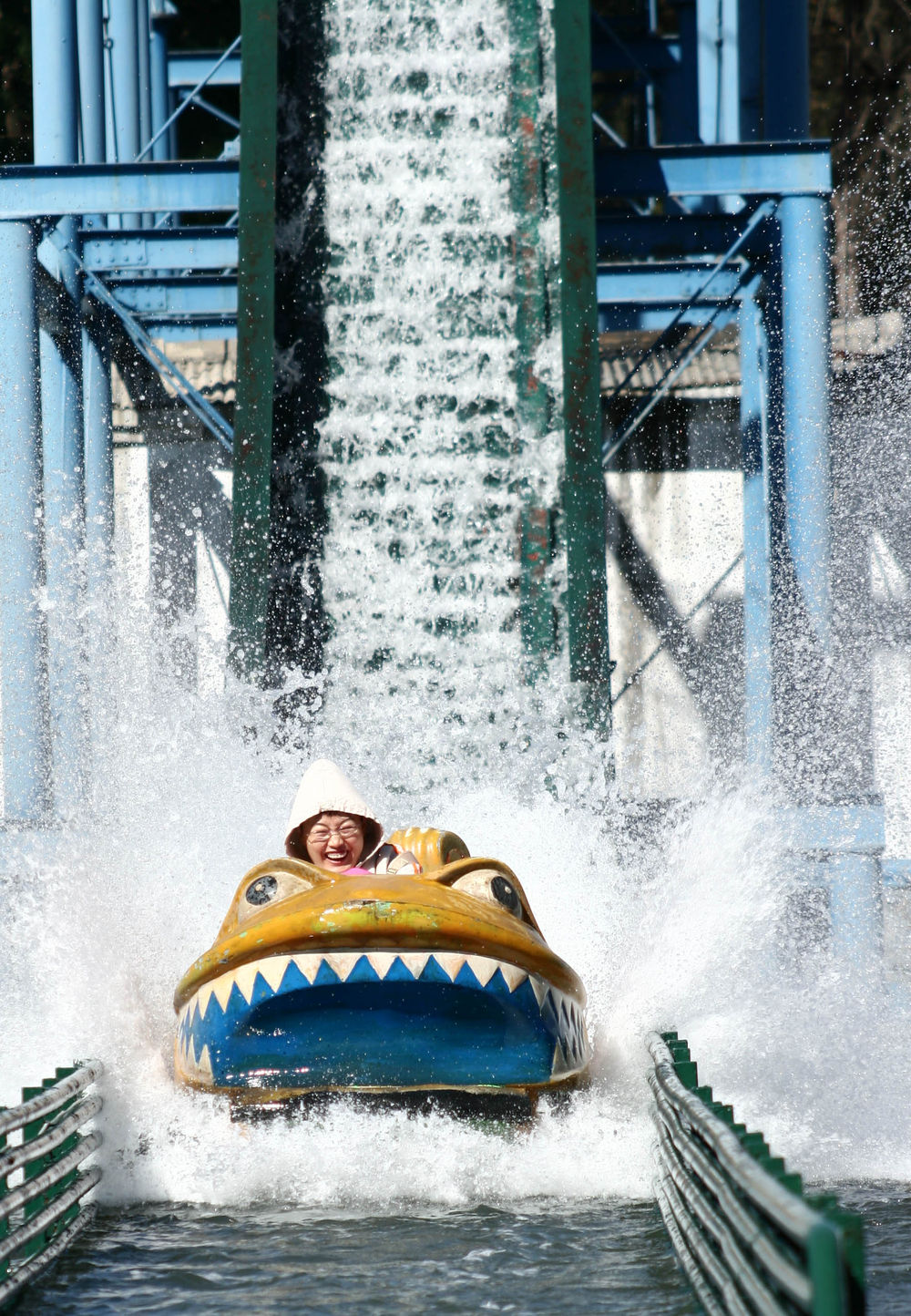 ↑2005年10月3日,几名游客在吉林市江南公园乘坐游船“激流勇进”。新华社 发