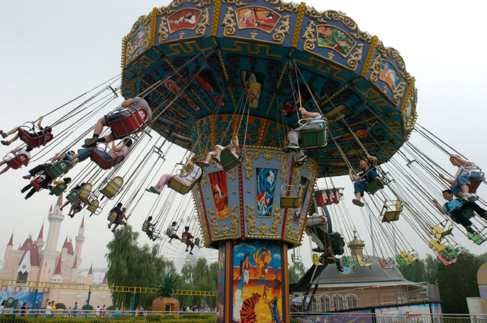 ↑2004年7月10日,游客们在北京石景山游乐园的旋转飞椅上尽情享受飞一般的感觉。新华社记者 李俊东 摄