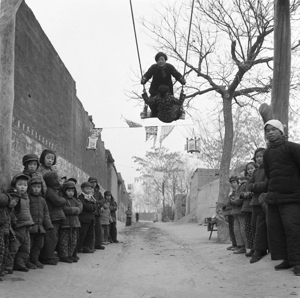 ↑1954年春节,河北省晋县五区刘靳庄的两位农村小姑娘快把秋千荡得和树梢头一般高了。新华社 发