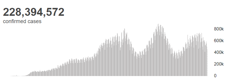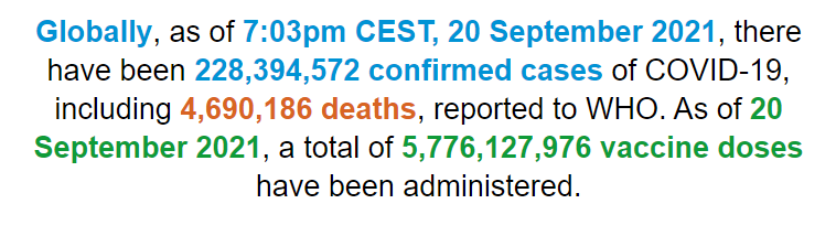 根据世卫组织最新实时统计数据,截至欧洲中部夏令时间9月20日19时03分(北京时间9月21日1时03分),全球累计新冠肺炎确诊病例228394572例,累计死亡病例4690186例。20日全球新冠肺炎确诊病例新增453600例,死亡病例新增7287例。(总台记者 朱赫)