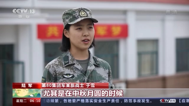 第80集团军某旅战士 于雪:每逢佳节倍思亲,尤其是在中秋月圆的时候,我们穿上这身军装,就要担起这份责任。今天我们不仅吃上了家乡菜,还品尝到了五湖四海的美味佳肴,这让我们感受到了部队大家庭的温暖。