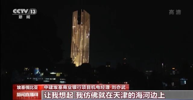 中建埃塞商业银行项目机电经理 刘亦武:每逢节日,国内城市的高层都会亮起这样的灯光秀。在埃塞我实现它了,每次当灯光变化的时候,让我想起我仿佛就在天津的海河边上。