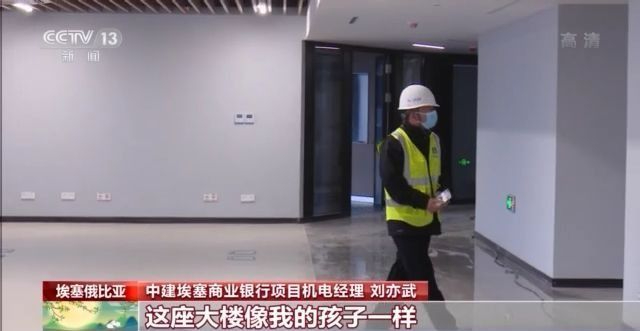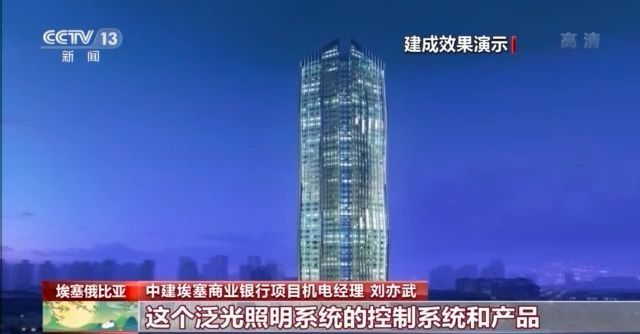 中建埃塞商业银行项目机电经理 刘亦武:我们这个项目采用的是全楼宇智能化管理,这种程度的科技应用,目前在埃塞是独一无二的。而且在其中,我们引入了很多中国品牌的物资和材料,比如晚上看到的灯光秀,这个泛光照明系统的控制系统和产品都来自中国品牌。