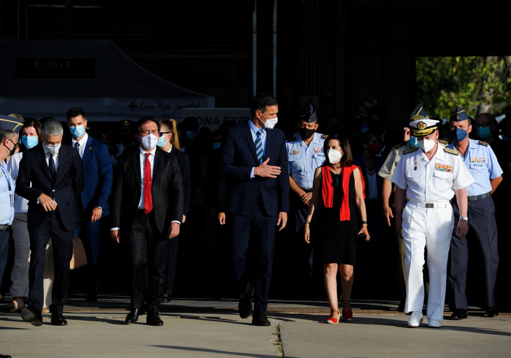 8月27日,西班牙首相佩德罗·桑切斯(中)视察托雷洪-德阿尔多斯空军基地。(新华社发,古斯塔沃·巴连特摄)