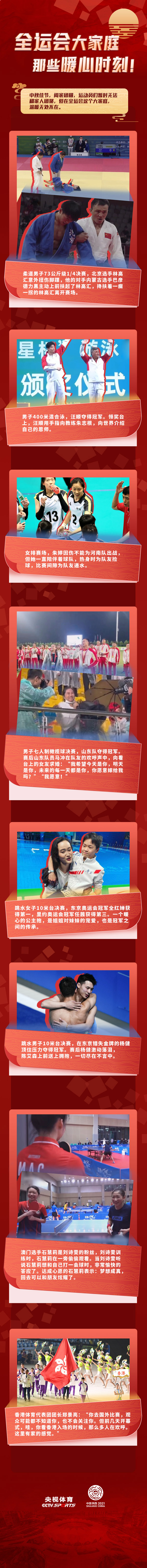 中秋佳节,阖家团圆,运动员们暂时无法和家人团聚,但是在全运会这个大家庭,温暖无处不在。一图了解↓↓↓
