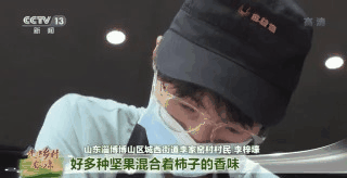山东淄博博山区城西街道李家窑村村民 李梓壕:摘下红彤彤的柿子,用清冽的山泉水洗净,做成柿子泥。再加上花生、腰果、松子仁、核桃、巴旦木,好多种坚果混合着柿子的香味。再用面饼包在一块。放入烤箱,烤上个把时辰,那甜甜的香味,就能把小馋猫们都引来。