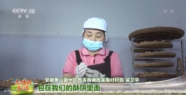 安徽黄山徽州区西溪南镇西溪南村村民 吴卫平:我们的土猪肉,七瘦三肥,剁成肉泥,然后跟梅干菜一起炒。炒干之后,就可以包在我们的酥饼里面,特别好,特别香。经过高温之后,口感比较酥脆。