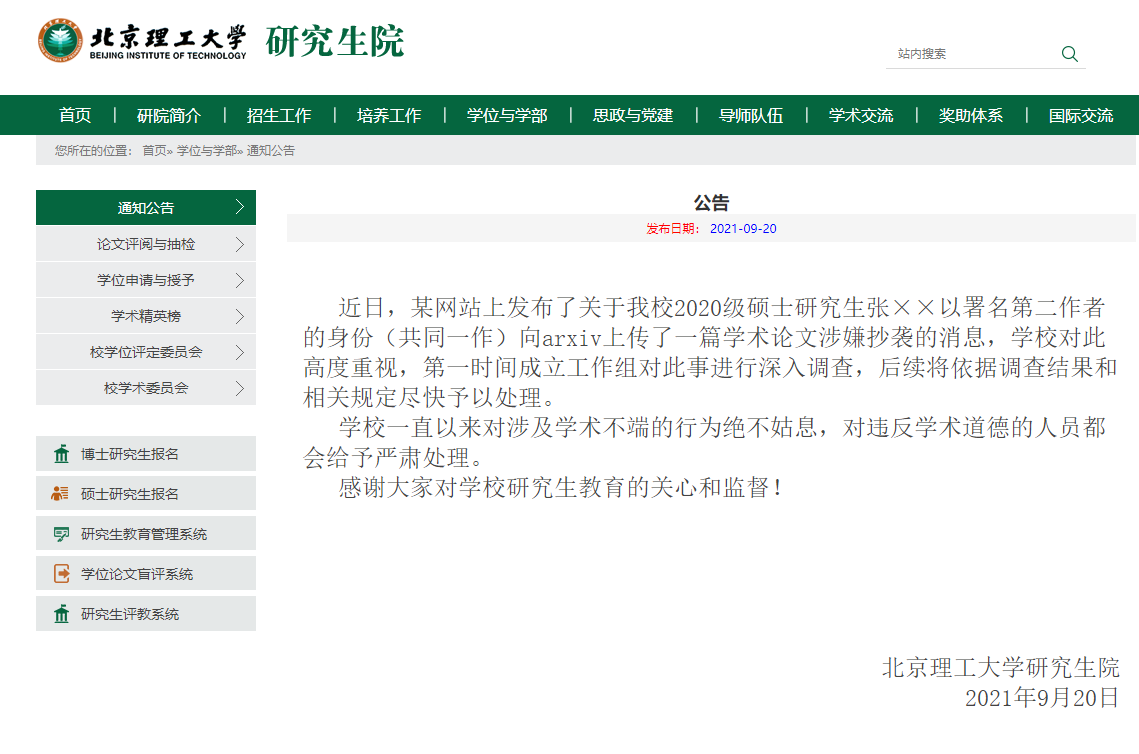 央视网消息:据北京理工大学研究生院网站消息,9月20日,北京理工大学研究生院在官网发布公告:近日,某网站上发布了关于我校2020级硕士研究生张××以署名第二作者的身份(共同一作)向arxiv上传了一篇学术论文涉嫌抄袭的消息,学校对此高度重视,第一时间成立工作组对此事进行深入调查,后续将依据调查结果和相关规定尽快予以处理。