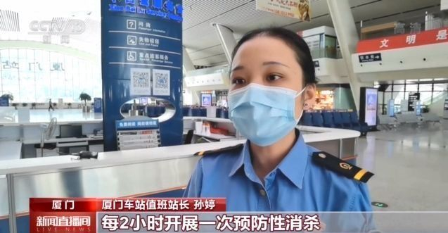 厦门车站值班站长 孙婷:我们对境外及国内中高风险地区入厦旅客,设置了专用出站通道,确保重点人群闭环管控;对候车厅座椅、电梯扶手、门把手等重点部位,做到每2小时开展一次预防性消杀,对“留观室”等特殊区域采取“随用随消”,并在醒目位置公示消毒情况,把牢铁路疫情防控关口。