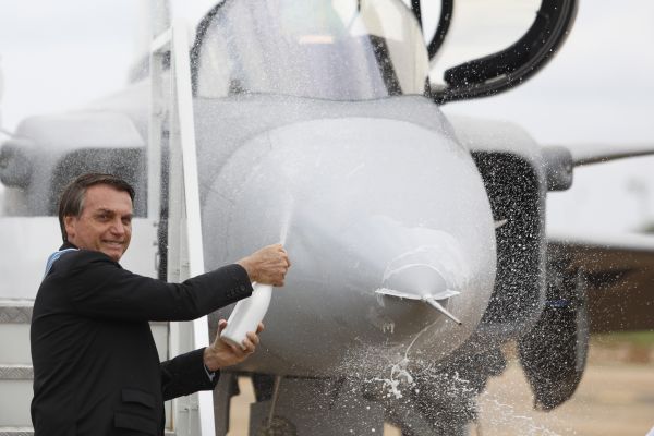 2020年10月23日,在巴西首都巴西利亚空军基地,巴西总统博索纳罗在一架F-39“鹰狮”战斗机前打开一瓶香槟酒。新华社发(卢西奥·塔沃拉摄)