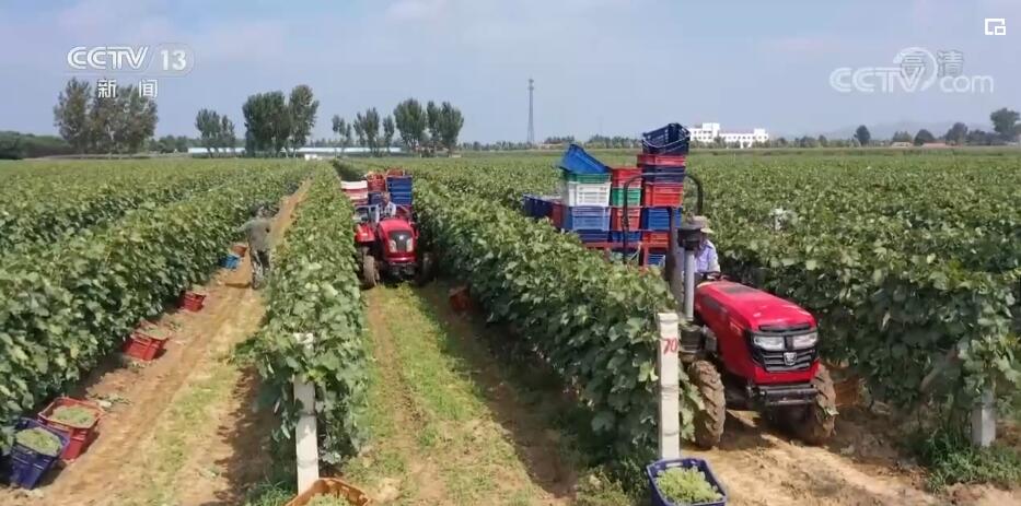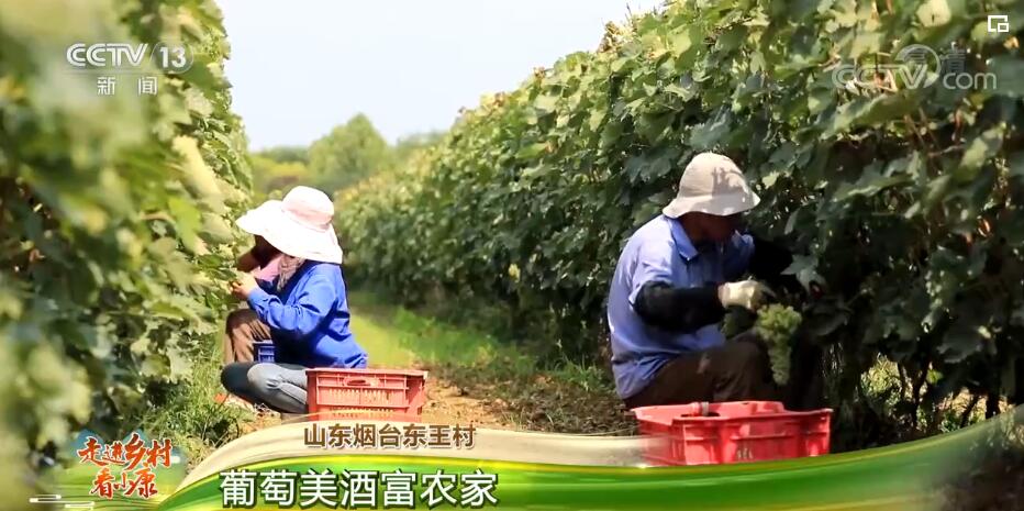 央视网消息:这里是山东烟台莱州市朱桥镇东王村的酿酒葡萄种植基地。片片绿叶下掩藏着串串翡翠般的葡萄,晶莹剔透,长势喜人。工人们正在采收葡萄,收获的葡萄将会进行分拣、榨汁,用来酿造葡萄酒。