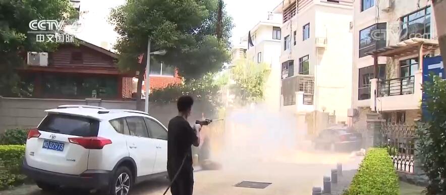从9月19日起,厦门小区重点公共区域已开启每日至少两次消杀工作。在厦门市集美区古龙明珠小区记者看到,物业工作人员正在使用高压冲洗消杀两用机,消毒架空层、过道等区域。