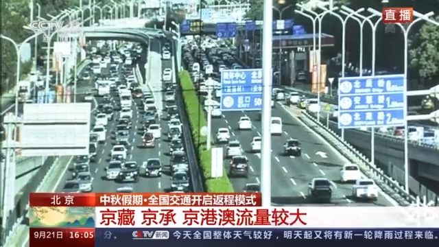 今天是中秋假期(19—21日)最后一天,全国铁路预计发送旅客880万人次,全国交通出行开启“返程模式”。因为天气晴朗,短途出游增多,北京的多条高速公路今天都出现了车流量偏大的现象。北京公安交管局靳赢介绍,高峰将持续到19时,请返程车辆耐心等待,不要强行并线频繁超车。