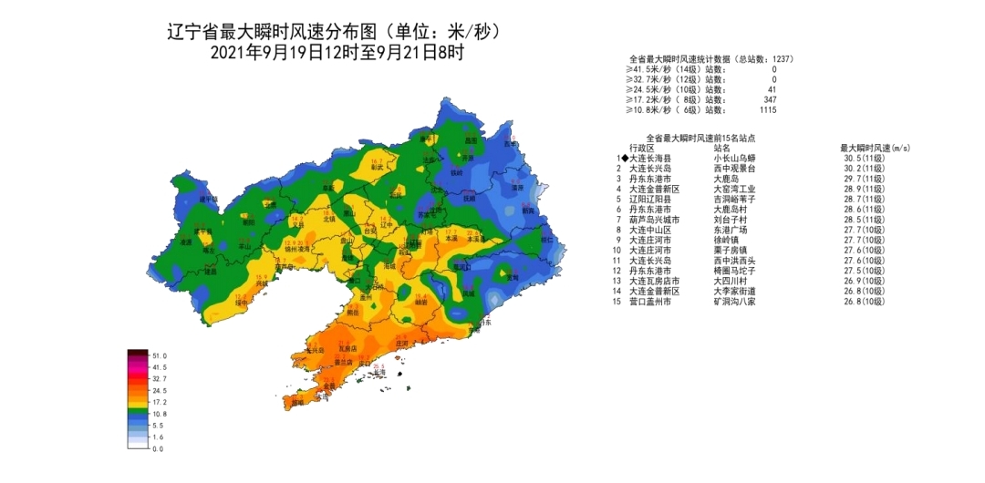 气象部门监测数据显示,9月19日午后至20日夜间,辽宁省出现2010年以来9月份影响范围最大、强度最强的暴风雨天气。辽宁省平均降雨量为74.8毫米,最大降雨量为341.5毫米,出现在葫芦岛兴城市徐大堡镇,最大瞬时风力11级(30.5 米/秒),出现在大连长海县小长山乌蟒。