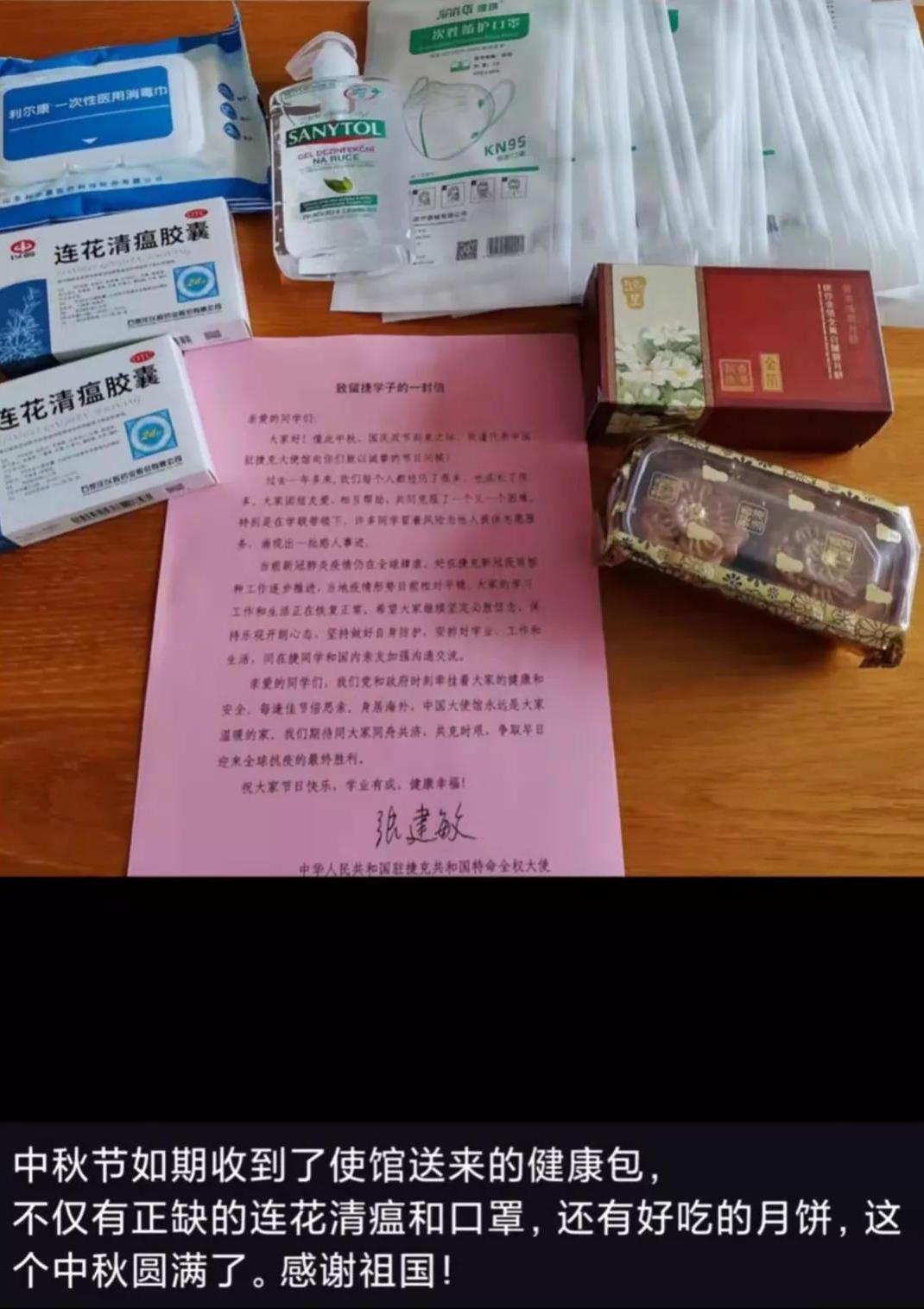 此次发放的“健康包”包含KN95口罩、连花清瘟胶囊、消毒洗手液、消毒湿纸巾、中秋月饼以及中国驻捷克大使张建敏慰问信等。