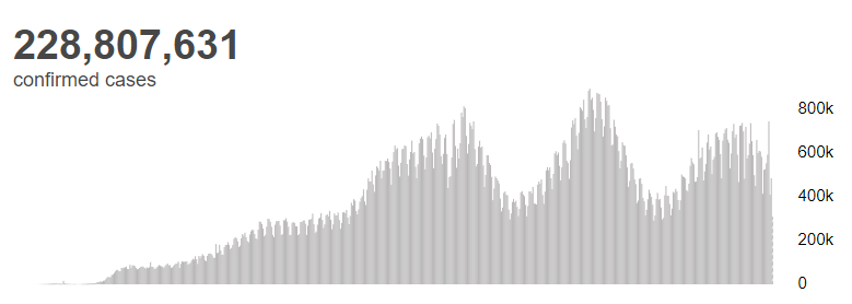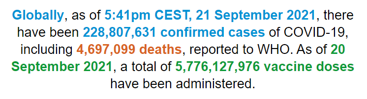 根据世卫组织最新实时统计数据,截至欧洲中部夏令时间9月21日17时41分(北京时间9月21日23时41分),全球累计新冠肺炎确诊病例228807631例,累计死亡病例4697099例。21日全球新增新冠肺炎确诊病例308107例,新增死亡病例5082例。(总台记者 朱赫)