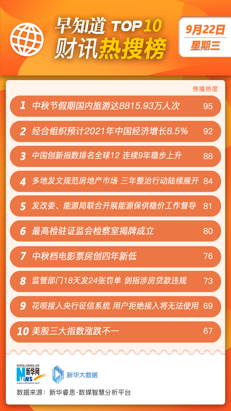 【早知道·财讯热搜榜TOP10】运用新华睿思大数据平台,从各媒体信源数据抓取最近24小时财经新闻、事件、话题传播热度排行。