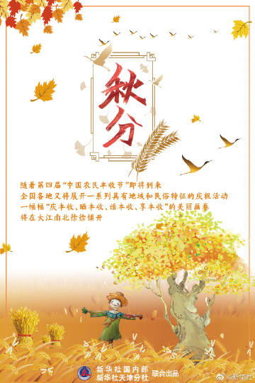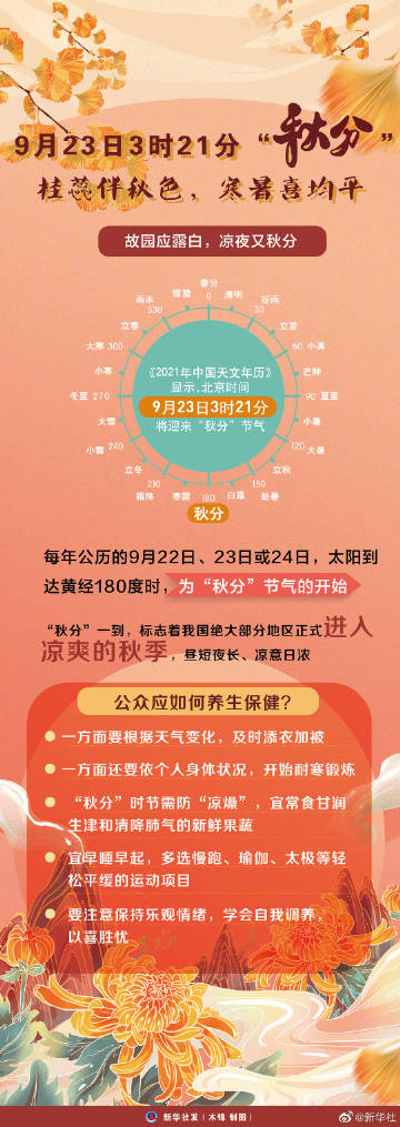 【#9月23日迎秋分#】《2021年中国天文年历》显示,北京时间9月23日3时21分将迎来“秋分”节气。此时节,天高云淡,露冷风清,凫雁高去,桂蕊飘香。“秋分”时节,到处弥漫着成熟的喜悦,因为#一年一度的中国农民丰收节#又来到了。