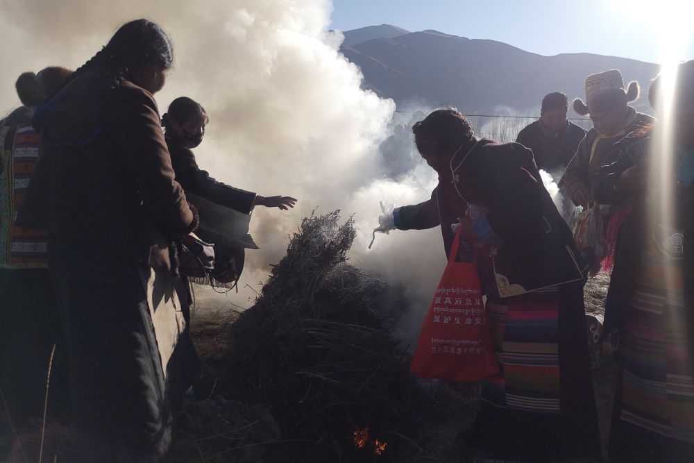 我想起了3月去山南乃东区克松社区参加春耕仪式。人们身着节日盛装,点燃起由松柏枝和青稞苗混合而成的香料,互敬哈达和青稞酒,然后播撒青稞种子。