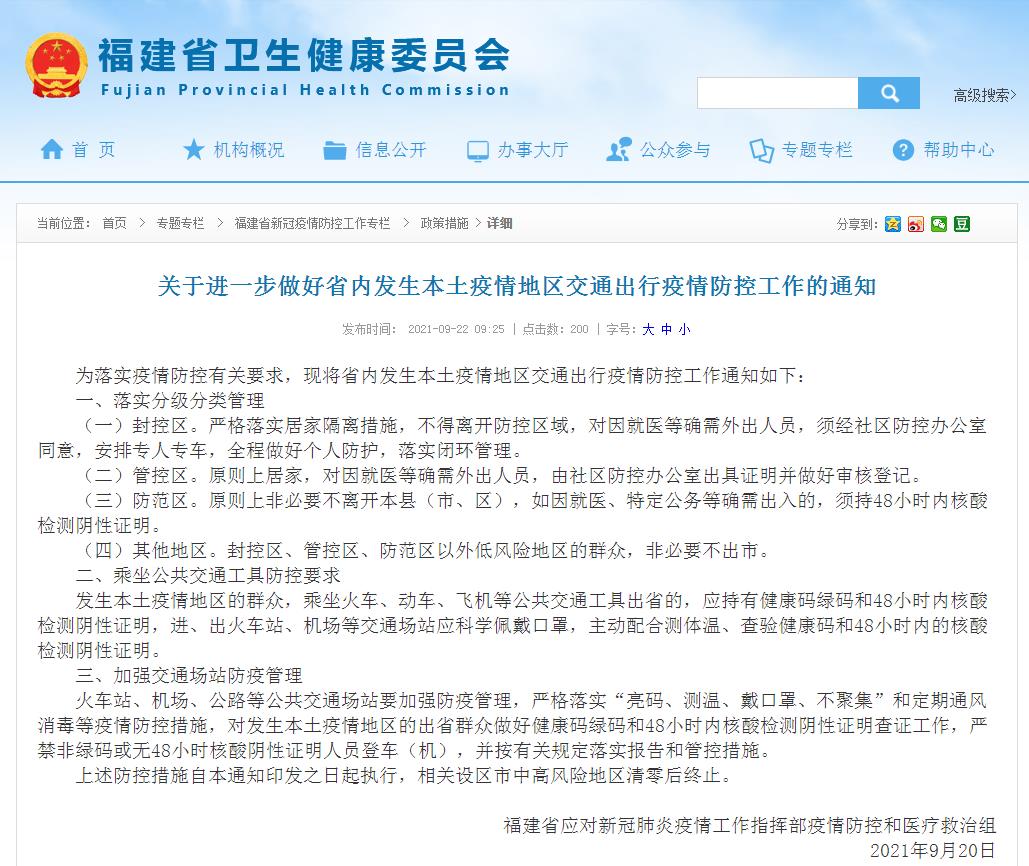 央视网消息:据福建省卫健委网站消息,根据福建省应对新冠肺炎疫情工作指挥部疫情防控和医疗救治组发布的《关于进一步做好省内发生本土疫情地区交通出行疫情防控工作的通知》要求,发生本土疫情地区的群众,乘坐火车、动车、飞机等公共交通工具出省的,应持有健康码绿码和48小时内核酸检测阴性证明,进、出火车站、机场等交通场站应科学佩戴口罩,主动配合测体温、查验健康码和48小时内的核酸检测阴性证明。上述防控措施自本通知印发之日起执行,相关区市中高风险地区清零后终止。