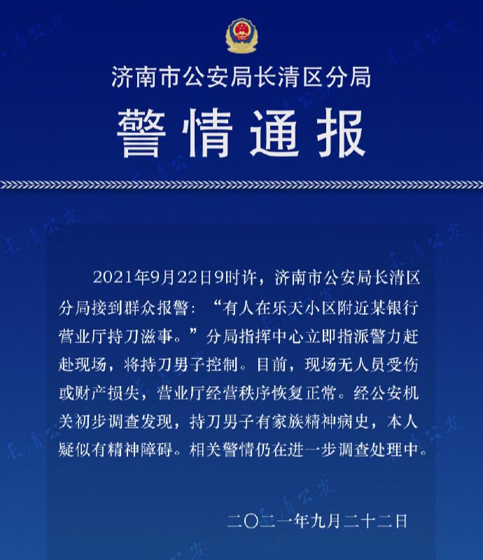 央视网消息:据济南公安长清分局微博9月22日消息,今日9时许,济南市公安局长清区分局接到群众报警:“有人在乐天小区附近某银行营业厅持刀滋事。”分局指挥中心立即指派警力赶赴现场,将持刀男子控制。目前,现场无人员受伤或财产损失,营业厅经营秩序恢复正常。经公安机关初步调查发现,持刀男子有家族精神病史,本人疑似有精神障碍。相关警情仍在进一步调查处理中。