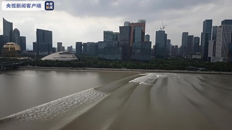 2021年8月25日15时50分,无人机从空中拍摄到杭州市城市阳台附近的钱塘江特色潮“波纹潮”,潮高近0.8m。