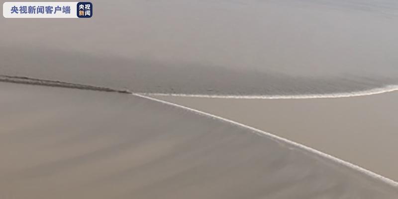 △北岸海宁盐官潮形呈现一条直线(左侧为上游)