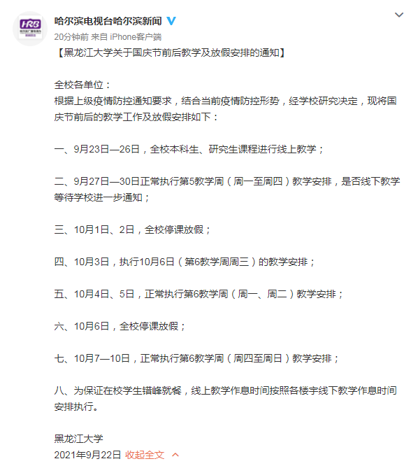 央视网消息:据@哈尔滨电视台哈尔滨新闻微博消息,黑龙江大学关于国庆节前后教学及放假安排的通知。根据上级疫情防控通知要求,结合当前疫情防控形势,经学校研究决定,现将国庆节前后的教学工作及放假安排如下: