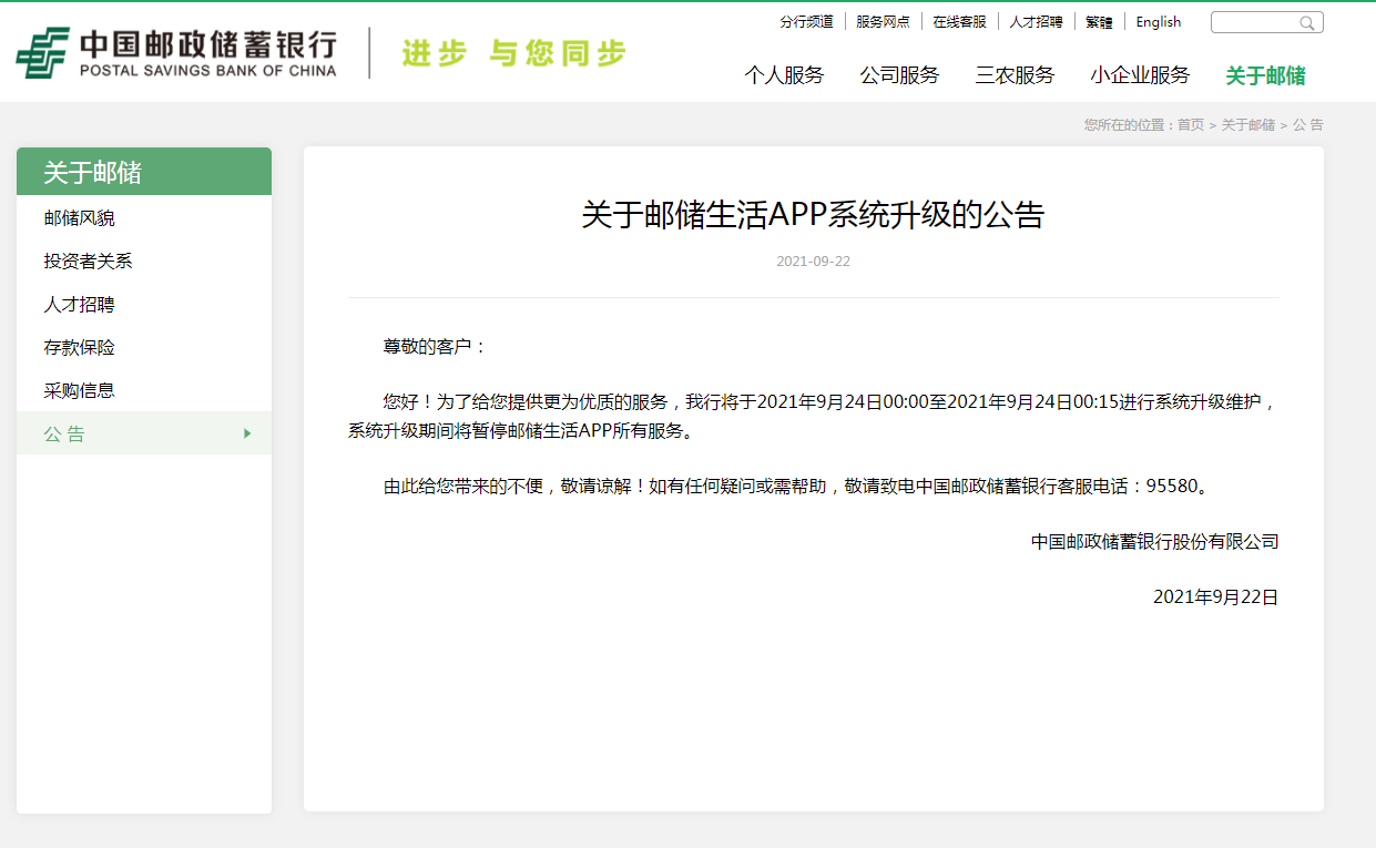 央视网消息:据中国邮政储蓄银行官网消息,9月22日,中国邮政储蓄银行官网发布关于邮储生活APP系统升级的公告。