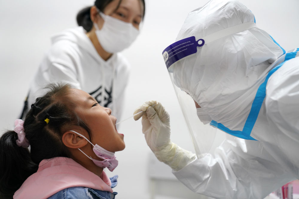 ↑9月22日,在哈尔滨市南岗区保健路街道松江新城社区核酸检测点,一名小朋友在进行核酸检测。