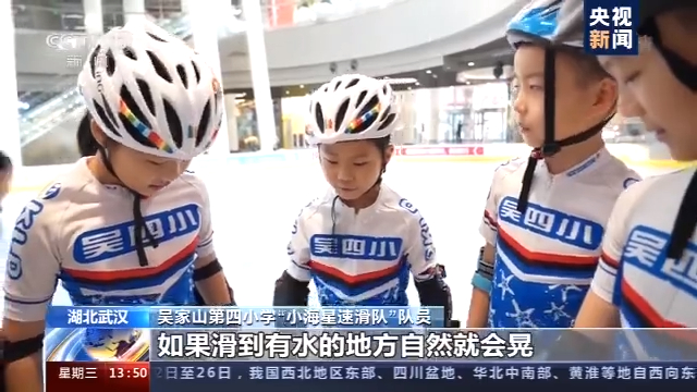 吴家山第四小学“小海星速滑队”队员:跑快了之后,就会这样抖,小幅度抖。搞得我们平衡力都不好发挥,冰刀是特别细的,如果滑到有水的地方自然就会晃。