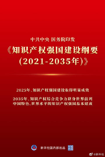 【#权威快报#|#知识产权强国建设纲要#发布】近日,中共中央、国务院印发了《知识产权强国建设纲要(2021-2035年)》。纲要提出,到2025年,知识产权强国建设取得明显成效;到2035年,知识产权综合竞争力跻身世界前列,中国特色、世界水平的知识产权强国基本建成。纲要部署了“建设面向社会主义现代化的知识产权制度”“建设支撑国际一流营商环境的知识产权保护体系”“建设激励创新发展的知识产权市场运行机制”“建设便民利民的知识产权公共服务体系”“建设促进知识产权高质量发展的人文社会环境”“深度参与全球知识产权治理”六个方面重点任务。(记者张泉、温竞华,海报设计杨轶群)