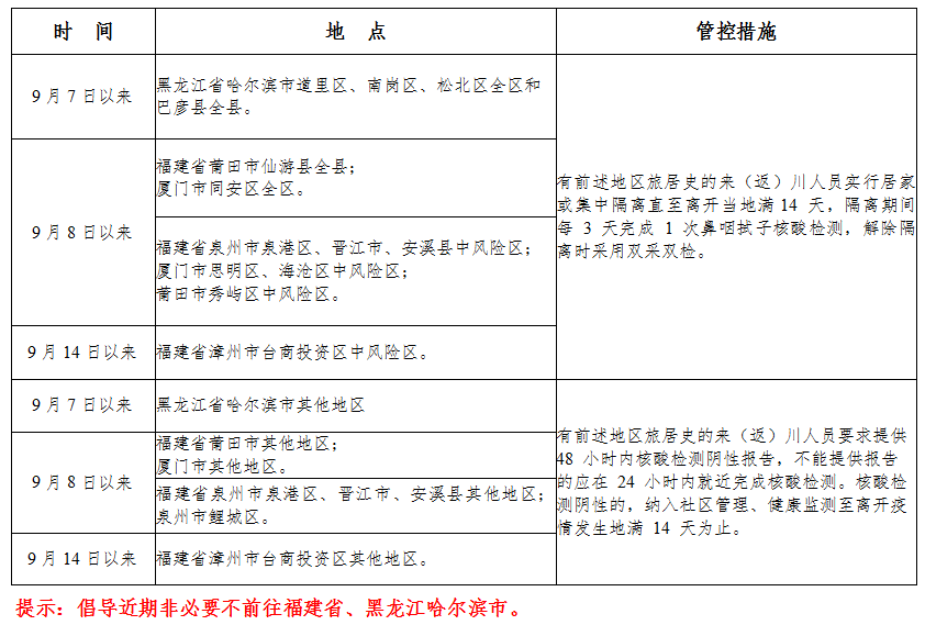 有福建省莆田市、泉州市、厦门市、漳州市,黑龙江省哈尔滨市旅居史的来(返)川人员、所有健康码为“红码”和“黄码”人员均需第一时间主动向所在社区、工作单位或所住酒店报备,配合做好各项防控措施。