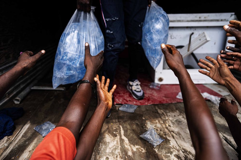8月21日,人们在海地莱凯附近的马瑟林领取生活物资。(新华社发,戴维·德拉帕斯摄)
