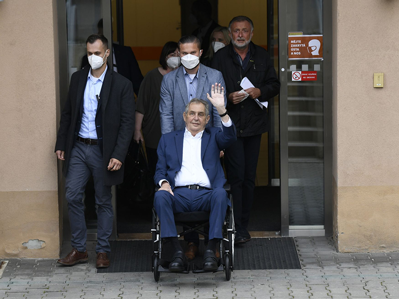 当地时间9月22日上午,捷克总统泽曼在妻子及总统府工作人员的陪同下出院。登车离开医院前,泽曼坐在轮椅中向现场的媒体挥手致意。