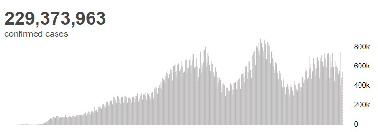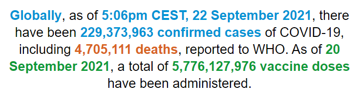 根据世卫组织最新实时统计数据,截至欧洲中部夏令时间9月22日17时06分(北京时间9月22日23时06分),全球累计新冠肺炎确诊病例229373963例,累计死亡病例4705111例。22日全球新增新冠肺炎确诊病例545201例,新增死亡病例7797例。(总台记者 朱赫)
