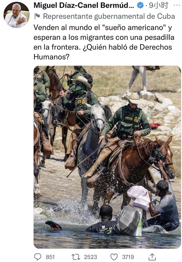 当地时间9月22日,古巴国家主席迪亚斯-卡内尔在社交媒体上发文,批评美国政府在其南部边境驱逐海地移民的行为“侵犯人权”。迪亚斯-卡内尔表示:“(美国)向全世界兜售‘美国梦’,而在边境等待移民的却是一场噩梦,是谁口口声声地在谈人权?”