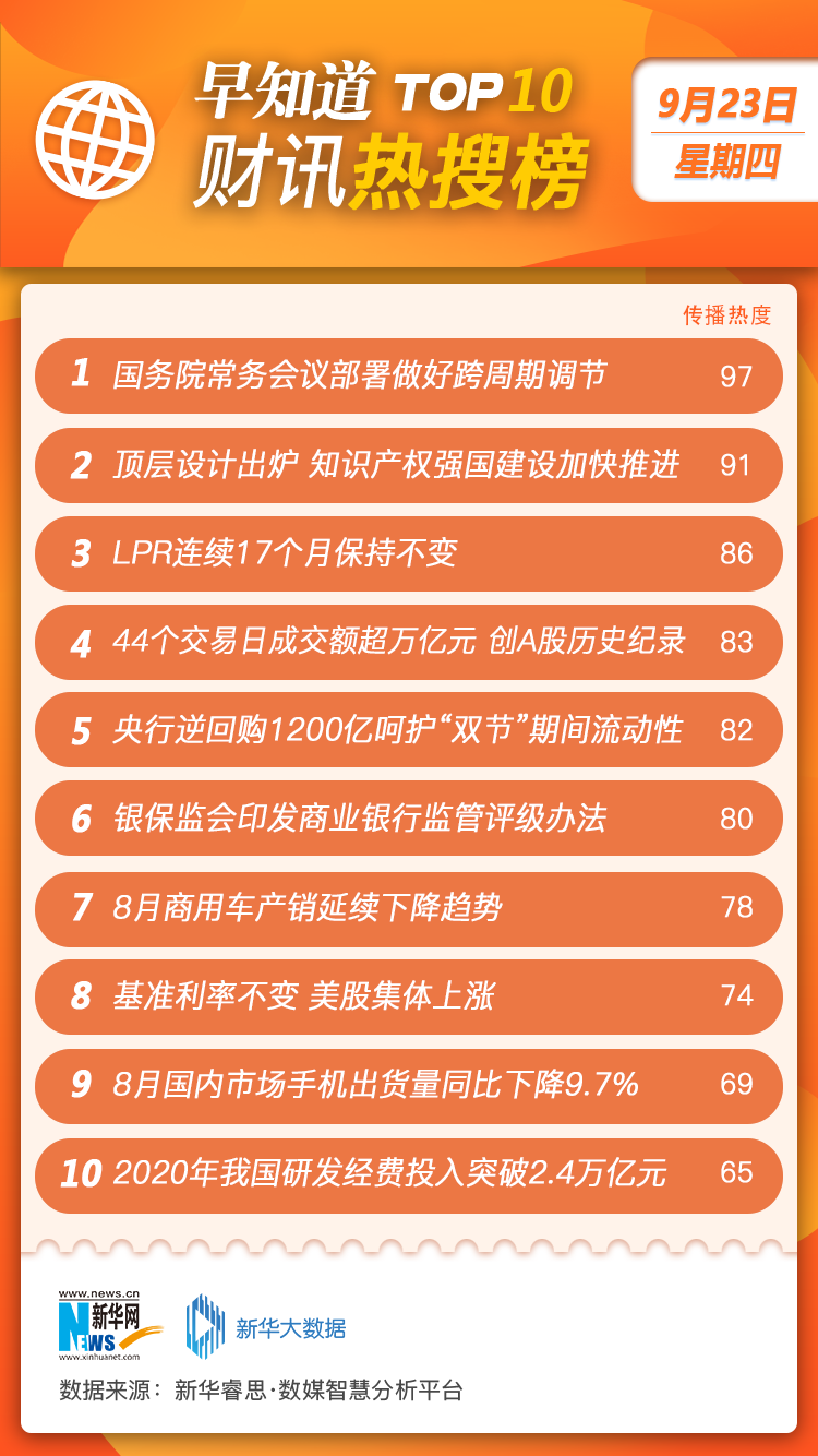 【早知道·财讯热搜榜TOP10】运用新华睿思大数据平台,从各媒体信源数据抓取最近24小时财经新闻、事件、话题传播热度排行。