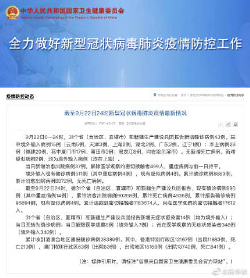 截至9月22日24时,据31个省(自治区、直辖市)和新疆生产建设兵团报告,现有确诊病例990例(其中重症病例14例),累计治愈出院病例90268例,累计死亡病例4636例,累计报告确诊病例95894例,现有疑似病例4例。累计追踪到密切接触者1183674人,尚在医学观察的密切接触者17612人。