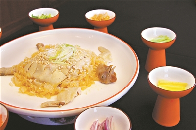封开杏花鸡用精制白卤水浸制后,连骨头都已经非常入味,将其撕成份量均匀的手撕鸡,拌入海蜇、芒果丝、葱丝、椒丝等十几种食材,做成金丝香芒捞手撕鸡。在手撕鸡的基础上创新演绎,鸡味浓郁、口味甘香、口感清爽,每一口都散发鸡肉与卤水金牌搭配后的独特鲜香。既不会有粤式传统做出来稍黏腻的口感,还因为芒果丝等食材的加入层次更为丰富,创造出杏花鸡的别致风味。