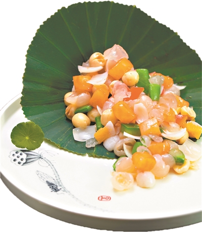 清汤雪莲子是用经过6个小时熬制而成的清鸡汤融合雪莲子,鸡汤的鲜味被雪莲子吸收,搭配上香甜的雪梨,清汤的鲜味与甜味在舌尖上绽放;龙皇汤雪莲子石榴球,皮嫩鲜滑石榴球,搭配鲜大虾熬制的龙皇汤,汤水锁住了虾的鲜味。雪莲子口感软糯,品尝更添口感;西汁雪莲子牛仔粒则选用雪花牛仔粒和雪莲子,搭配酸酸的汁酱,外表色泽鲜艳,味道酸甜可口。