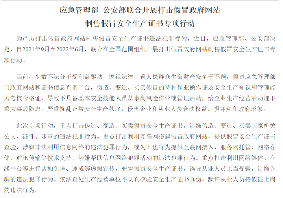 央视网消息:据应急管理部网站消息,为严厉打击假冒政府网站制售假冒安全生产证书违法犯罪行为,近日,应急管理部、公安部决定,自2021年9月至2022年6月,联合在全国范围组织开展打击假冒政府网站制售假冒安全生产证书专项行动。