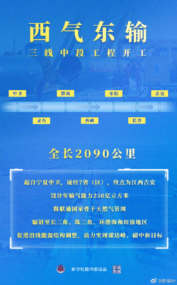 【#权威快报#|#西气东输三线中段工程开工#】23日,西气东输三线中段(中卫-吉安)工程在宁夏中卫正式开工建设。工程全长2090公里,起自宁夏中卫,途经宁夏、甘肃、陕西、河南、湖北、湖南、江西7省(区),终点为江西吉安。可在现有基础上,提高西气东输管道系统年输气量250亿立方米,与用煤相比,每年可减少二氧化碳排放量7089万吨,对保障沿线地区清洁能源供应,促进当地能源结构调整,助力实现碳达峰、碳中和目标具有重要作用。(记者戴小河,海报设计张晨光)