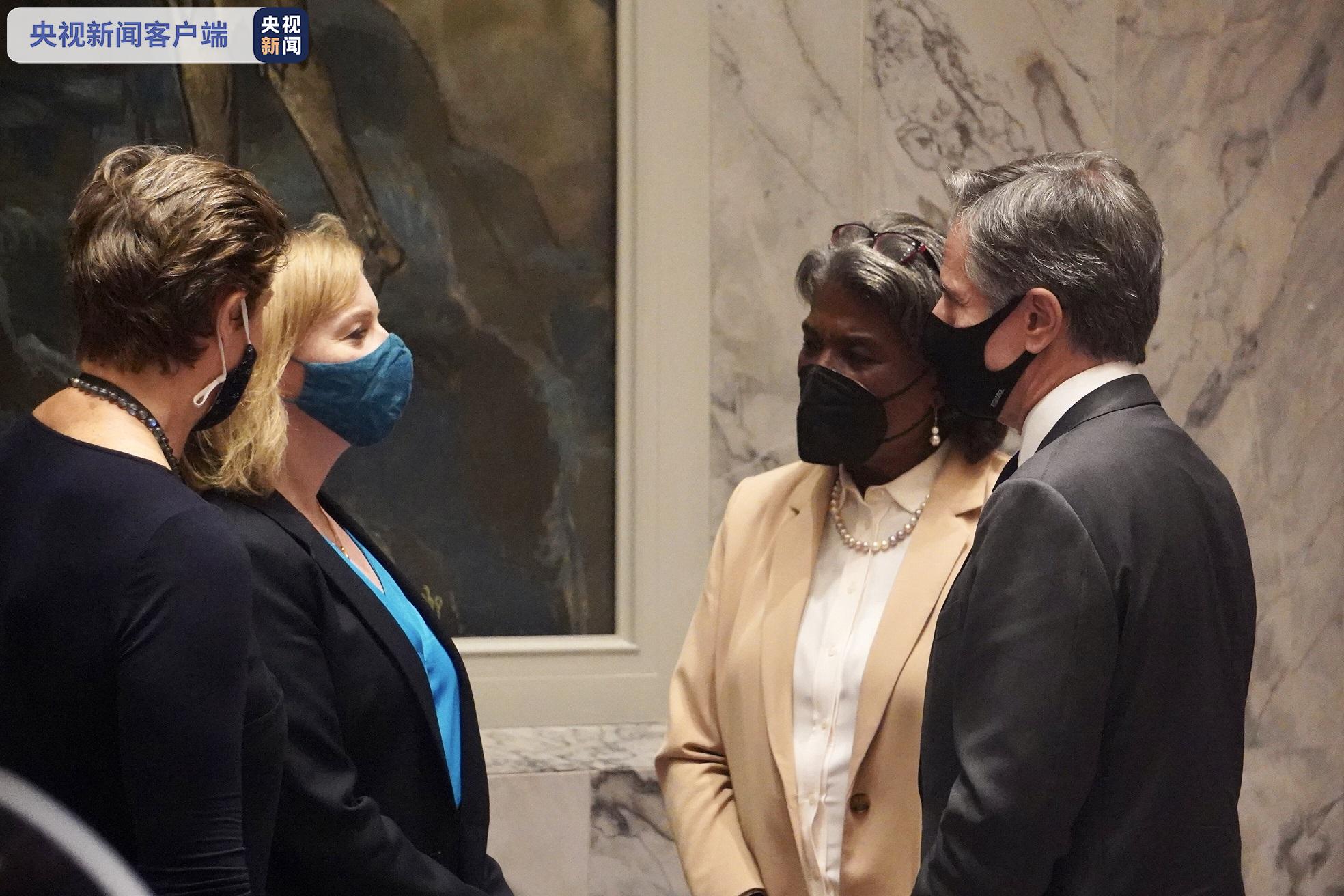 △中国常驻联合国代表张军与美国国务卿布林肯