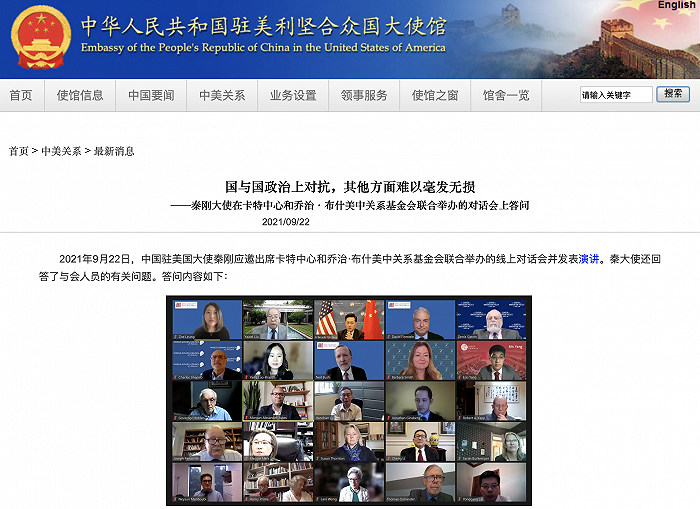央视网消息:据中国驻美国大使馆网站消息,2021年9月22日,中国驻美国大使秦刚应邀出席卡特中心和乔治·布什美中关系基金会联合举办的线上对话会并发表演讲。秦大使还回答了与会人员的有关问题。部分答问内容如下: