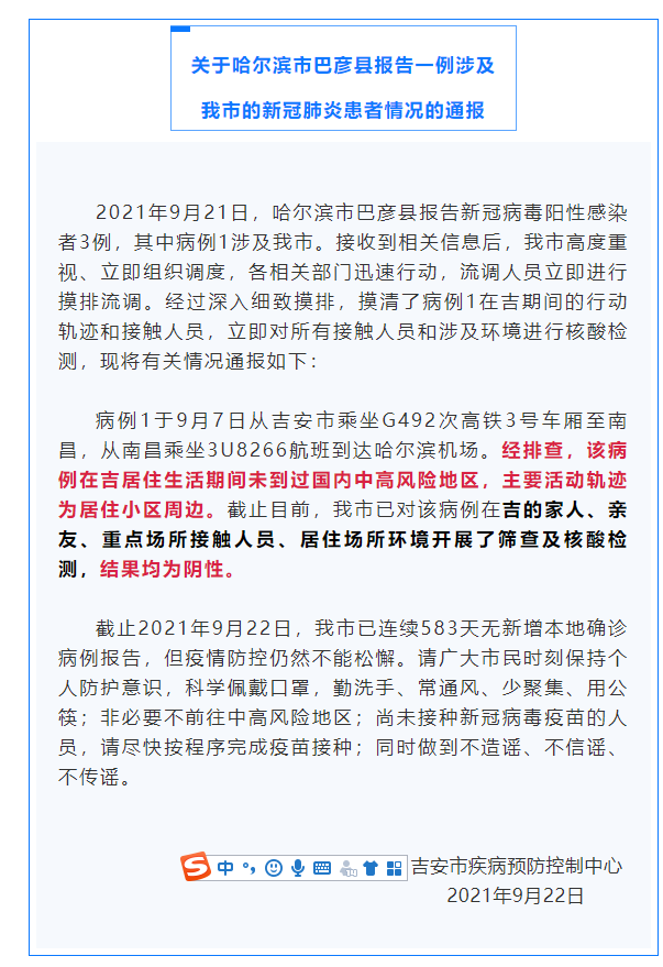 病例1于9月7日从吉安市乘坐G492次高铁3号车厢至南昌,从南昌乘坐3U8266航班到达哈尔滨机场。经排查,该病例在吉居住生活期间未到过国内中高风险地区,主要活动轨迹为居住小区周边。截止目前,吉安市已对该病例在吉的家人、亲友、重点场所接触人员、居住场所环境开展了筛查及核酸检测,结果均为阴性。