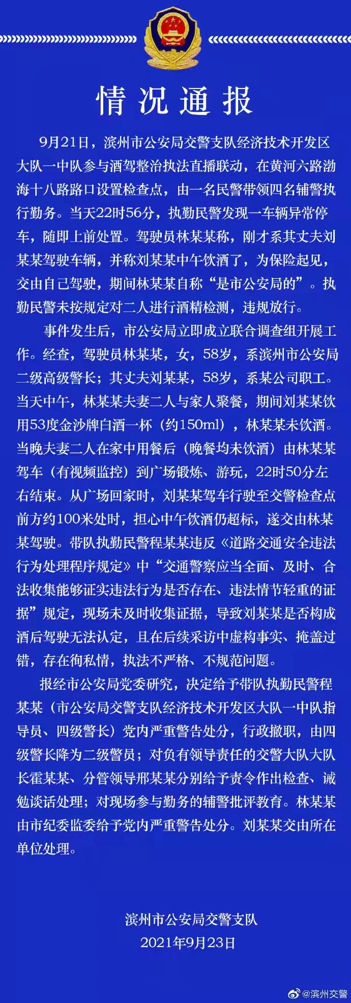 报经市公安局党委研究,决定给予带队执勤民警程某某(市公安局交警支队经济技术开发区大队一中队指导员、四级警长)党内严重警告处分,行政撤职,由四级警长降为二级警员;对负有领导责任的交警大队大队长霍某某、分管领导邢某某分别给予责令作出检查、诫勉谈话处理;对现场参与勤务的辅警批评教育。林某某由市纪委监委给予党内严重警告处分。刘某某交由所在单位处理。(总台记者 张明)