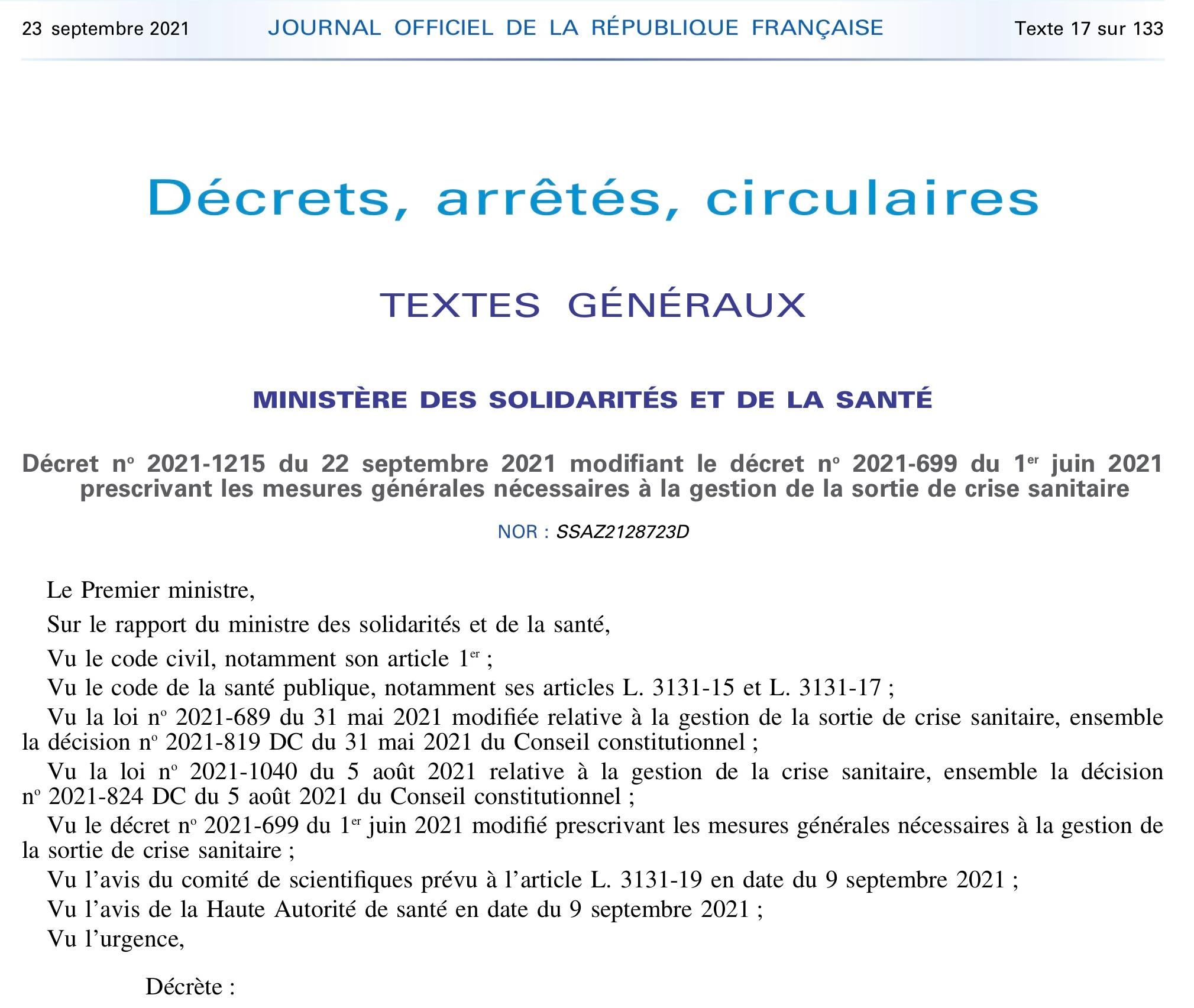 当地时间9月23日,法国政府公报最新公布的信息显示,法国总理让·卡斯泰于22日发布行政令,对可在法国获得新冠疫苗接种证明的条件进行了修改。