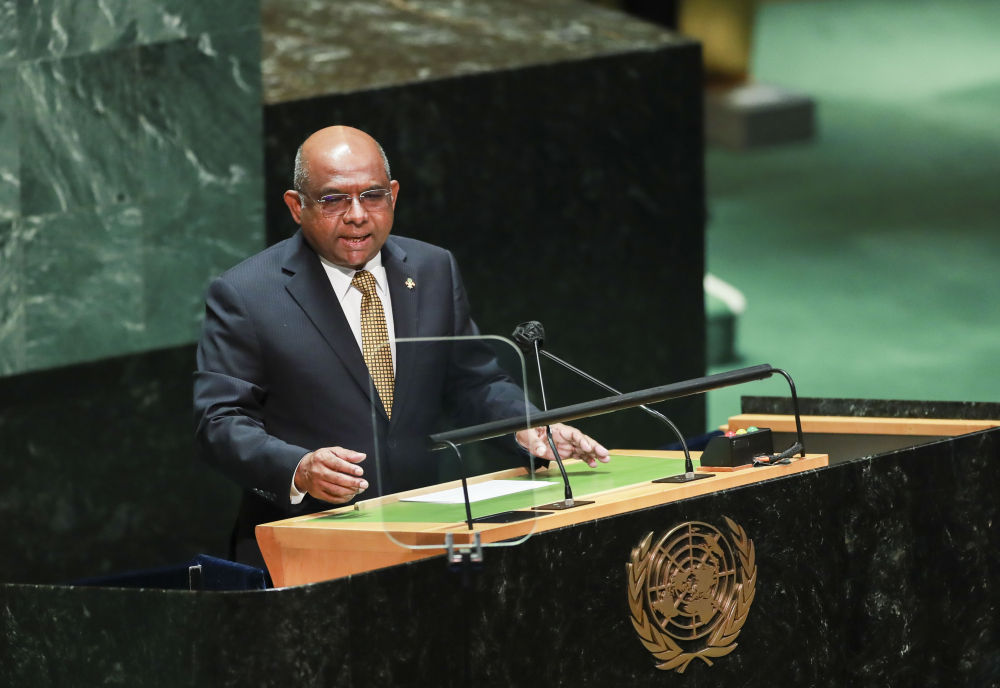 9月22日,在位于纽约的联合国总部,第76届联大主席阿卜杜拉·沙希德在会议上致辞。(新华社记者王迎摄)